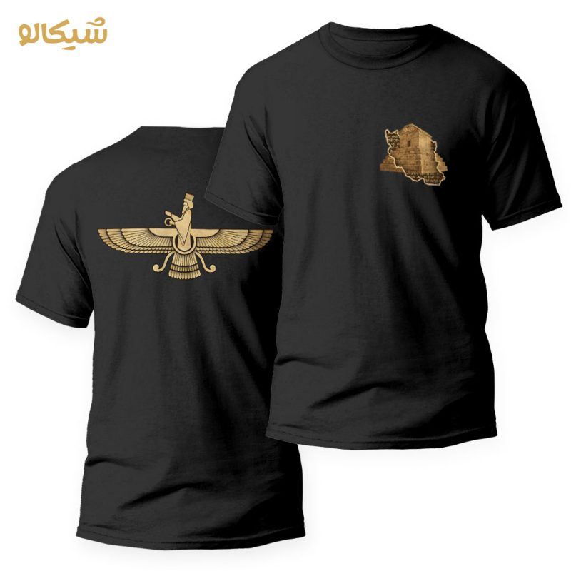 تیشرت با طرح تاریخی ایران باستان ترکیبی زیبا از آرامگاه کوروش بزرگ و نماد فروهر که برای علاقمندان به هویت و فرهنگ ایرانی طراحی شده است، این تیشرت بصورت دورو چاپ شده جلو روی سینه آرامگاه کوروش بزرگ واقع در پاسارگاد استان فارس در زمینه نقشه ایران امروزی و ترکیبی از خطوط میخی مربوط به منشور کوروش و در قسمت پشتی تیشرت نماد زیبای فروهر که از نماد های کهن و مهم فرهنگ ایرانی است، چاپ شده که نشانه ای از معنویت آزادی اندیشه و پیوند با تاریخ کهن ایران دارد.